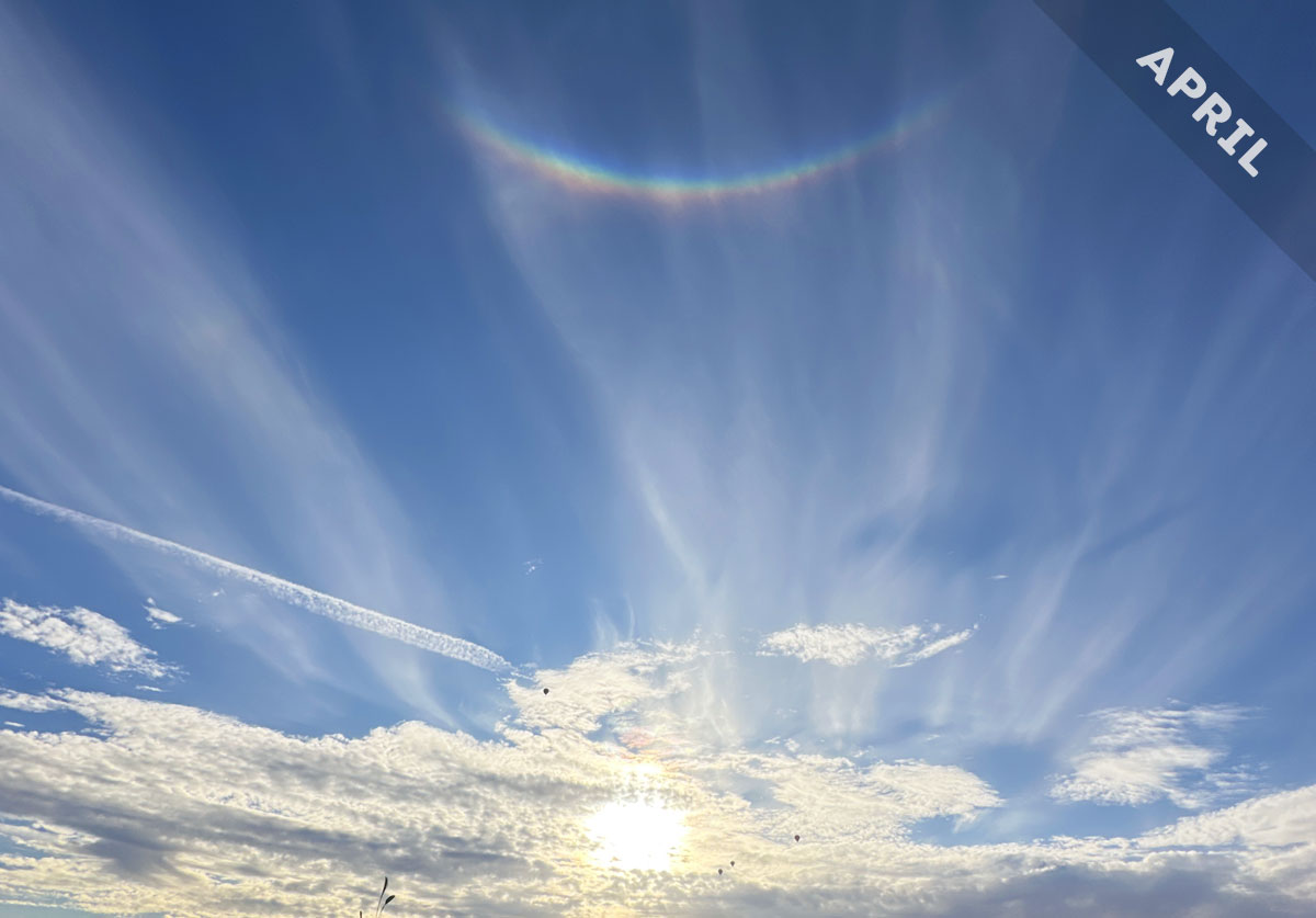 The circumzenithal arc featured as Cloud of the Month for April was spotted by Laura Simms (Member 32,141) over Surprise, Arizona, US. The wide-angle lens of her camera makes it seem lower in the sky than it actually would have been. The ice crystals that formed Laura’s circumzenithal arc came courtesy of high ice-crystal clouds known as Cirrus fibratus. The crystals up in this cloud would have been in the shape of tiny hexagonal plates of clear ice that were oriented with their large faces almost horizontal as they gently fell through the sky like autumn leaves. They acted like microscopic atmospheric prisms of ice, bending the light as it shone through them.