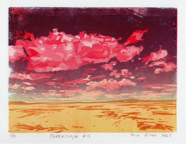 Tina Moore, Member 7,825, an artist based in South Australia, sent us her woodblock reduction print of clouds over Telowie Beach. She told us “This is one of a series of ‘Dreamscape’ prints, so called because of their altered colours and dreamlike scenes”