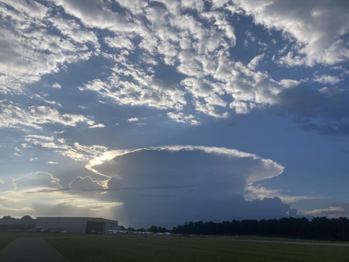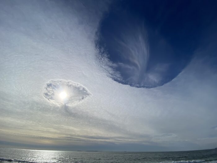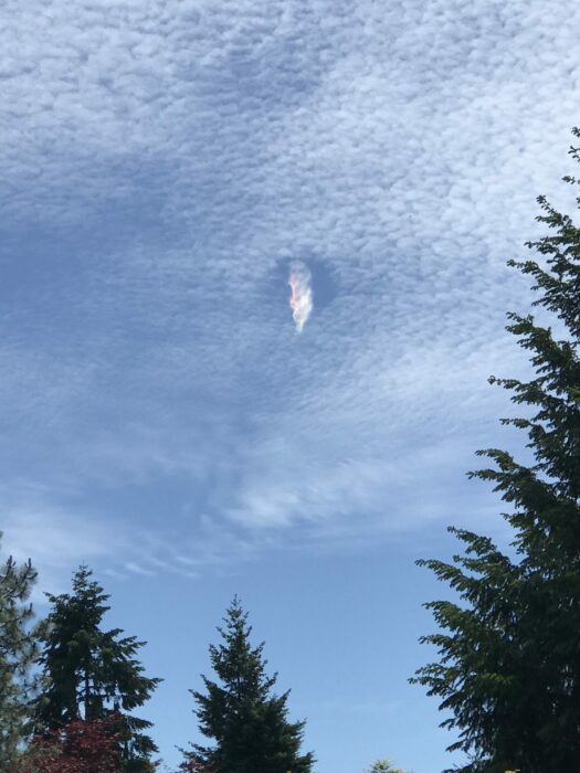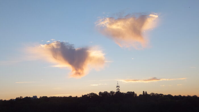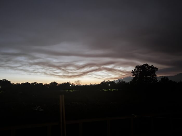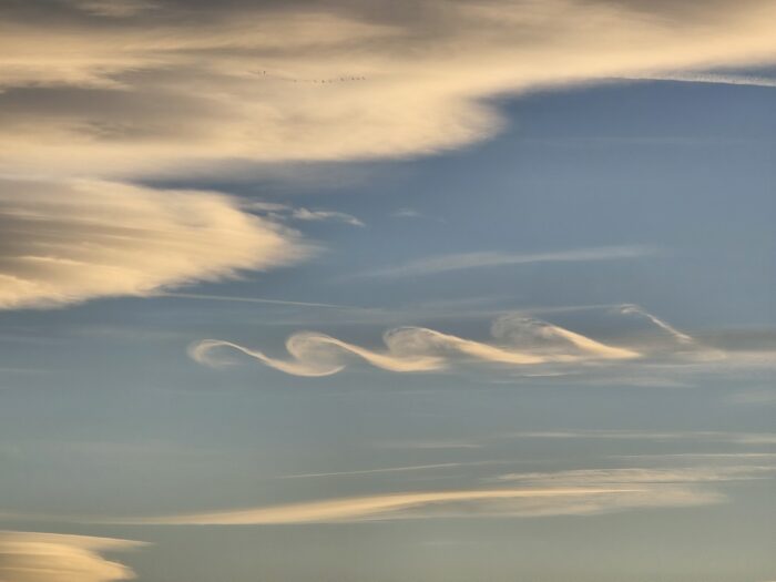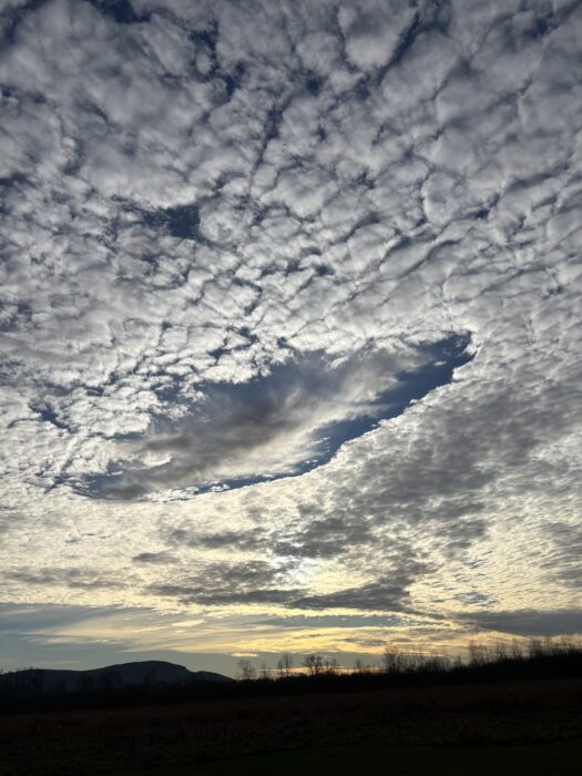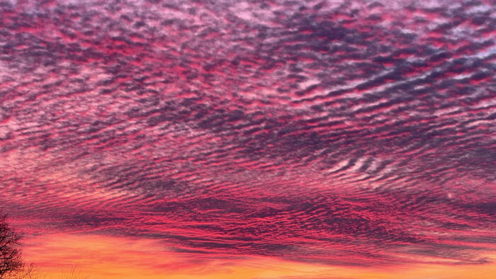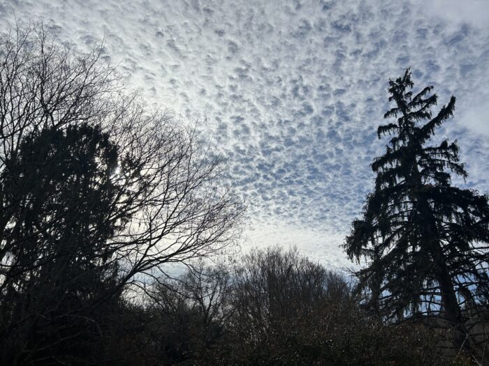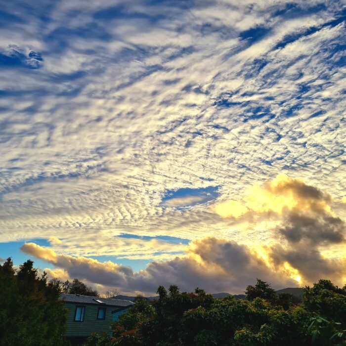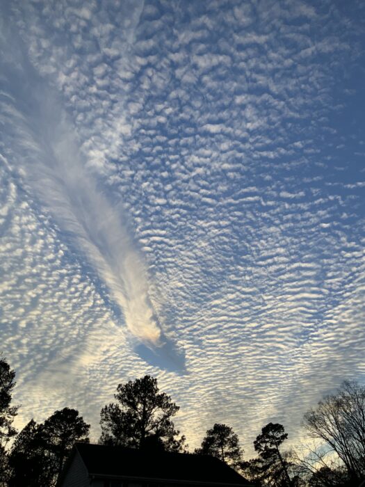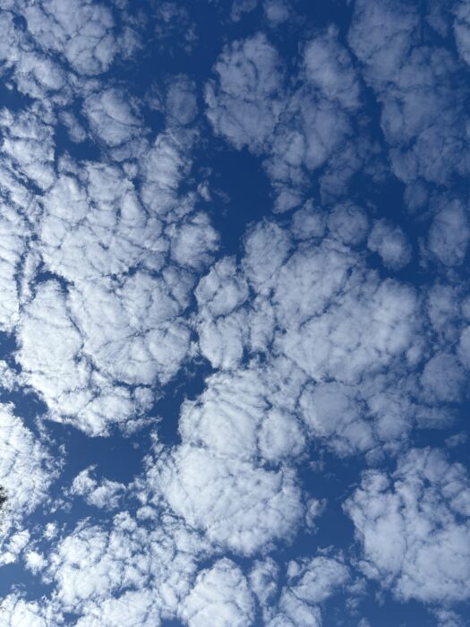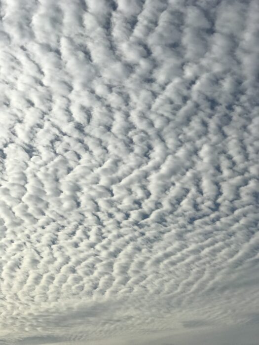 These are typically mid-level layers or patches of cloudlets, which form clumps or rolls. They are white or grey, and shaded on the side away from the sun. This distinguishes Altocumulus from the shade-free cloudlets of Cirrocumulus. Another’s the size of its cloudlets. These appear between the width of one and three fingers, held at arm’s length, when they’re more than 30˚ above the horizon.