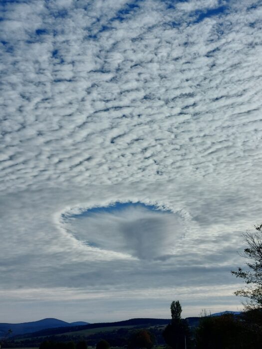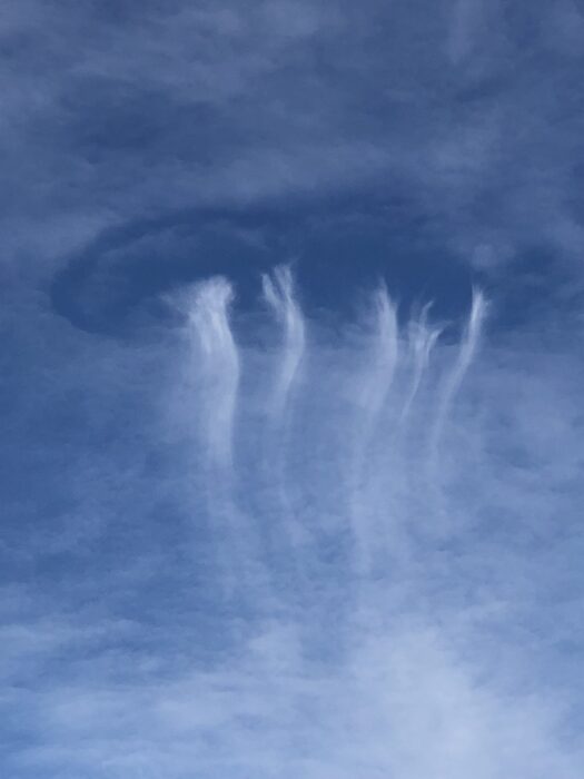 They look bizarre, but cavum, also known as fallstreak holes, are not actually that rare. They are crisp gaps in mid- or high-level cloud layers, below which dangle trails of ice crystals.