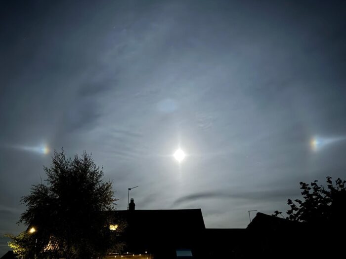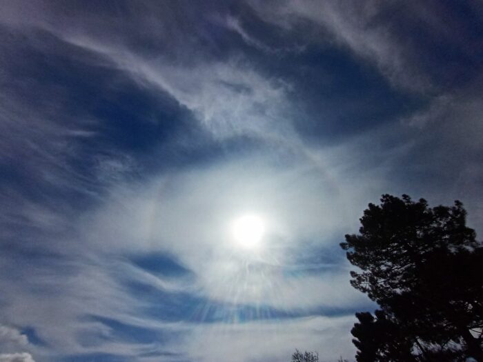 It also distinguishes itself as the best of the high clouds at producing the coloured arcs, rings and points of light known as halo phenomena. These can appear as the sunlight shining through a layer of Cirrostratus is refracted and reflected by the ice crystals, each of which can behave like a tiny prism. Halo phenomena certainly don’t always appear but, when they do, they can exhibit beautiful rainbow colours, and are a sure way to distinguish Cirrostratus from Altostratus, which, being lower and consisting (at least partially) of droplets, doesn’t produce them.