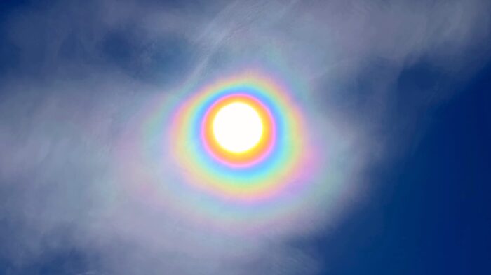 Closely related to cloud iridescence, coronae are caused when the light is diffracted as it passes around a cloud’s particles. Only if these are all very small and the cloud layer is thin will the colours of the corona appear distinct around the central bright disc. The smaller the cloud droplets, the larger the corona.