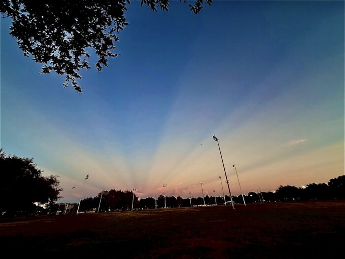 Crepuscular rays appear when the path of sunlight is made visible by tiny atmospheric particles, too scarce to appear as cloud, but plentiful enough to scatter the light noticeably. Like fingers through a torch beam, the cloud shadows give edges to the rays. In spite of being almost parallel, these rays seem to radiate outwards from behind the cloud. This is just the same perspective effect as railway tracks seeming to widen as they get nearer.
