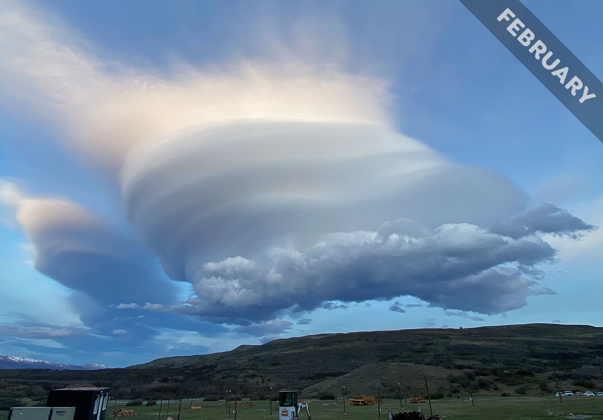 James Ewart spotted lenticularis and a rotor cloud downwind of the peaks near Torres del Paine National Park in Patagonia, Chile. The lenticularis clouds are in the middle and in the distance to the left, while the rotor cloud is just in front of the base of the nearer lenticularis.