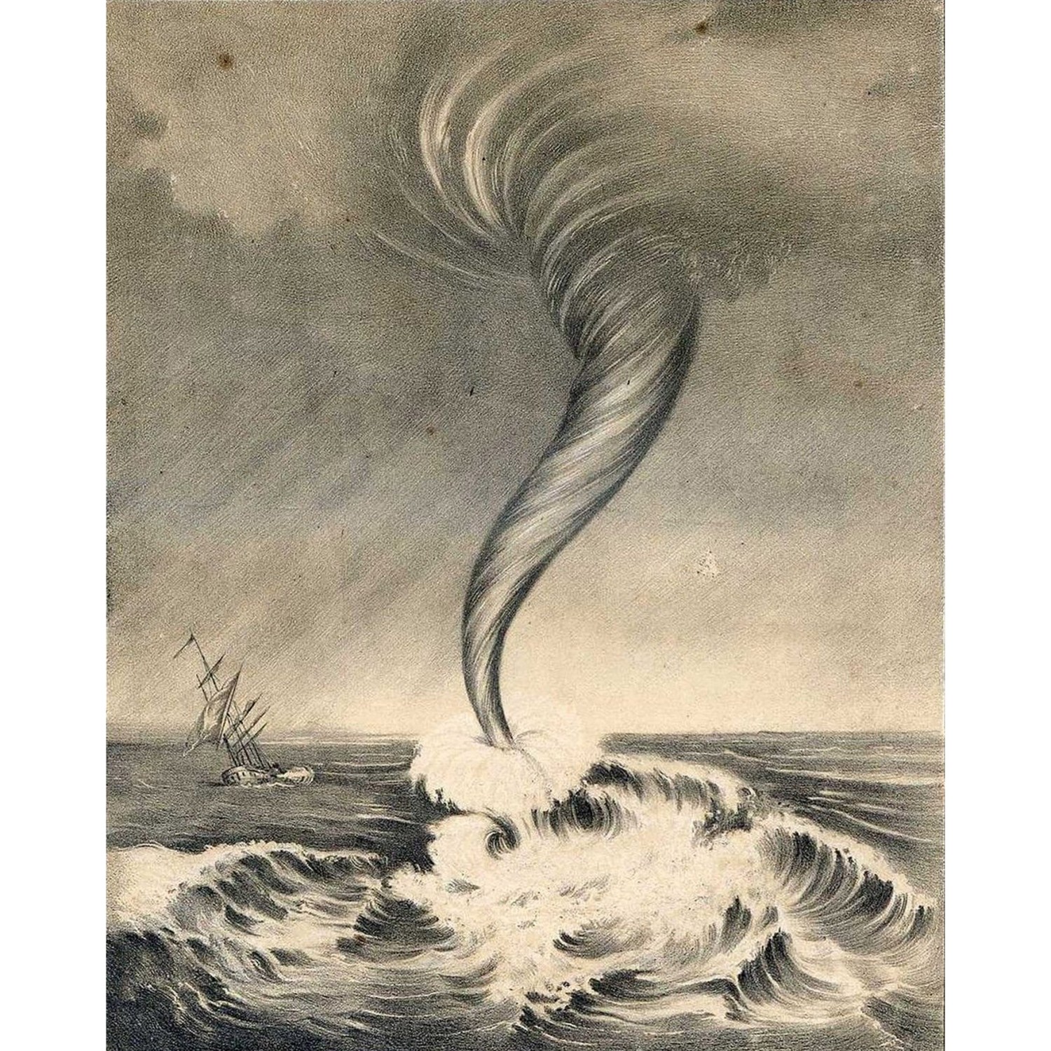 This is a depiction of a waterspout in Les Curiosités et les Merveilles de la Nature (‘Curiosities and Natural Wonders’) (1869) written by Jean-Baptiste Munerelle. A waterspout is a type of funnel cloud that can form over bodies of water when horizontal winds encounter the rapidly rising air beneath developing Cumulus congestus clouds. Though waterspouts look dramatic, they do not necessarily suggest that a storm is coming. Though they can form in the rotating updrafts of gathering thunderstorms, they are more common in coastal areas beneath Cumulus towers. Such waterspouts, all bark with no bite, are referred to as ‘non-tornadic’ or ‘fair-weather’ waterspouts.