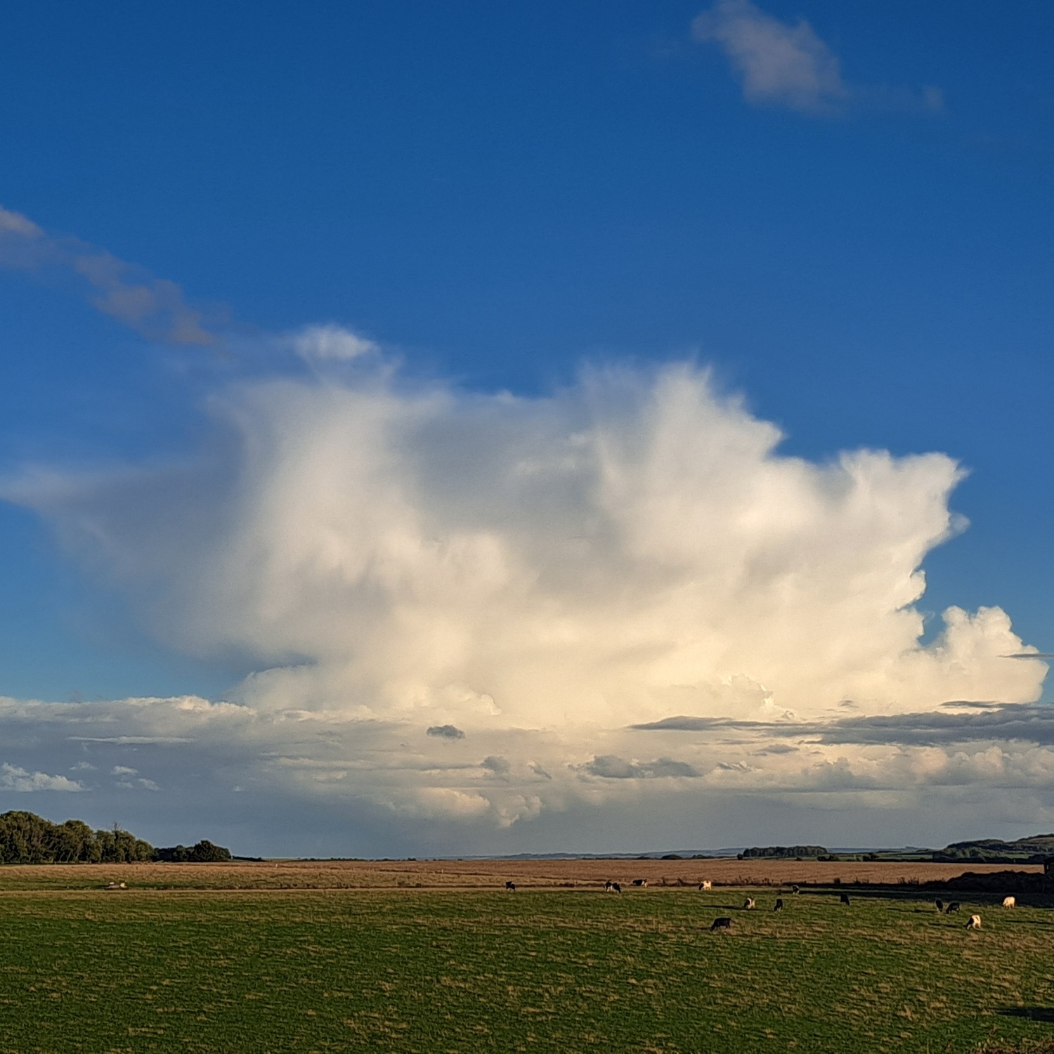 Over the grazing cows in Collingbourne Kingston, Wiltshire, England looms a Cumulonimbus capillatus incus. David Burnett (Member 9,444) spotted his lone storm cloud on an ‘active day of showers’. He notes that the cloud is ‘marshmallow soft but still packed with atmospheric power!’, and he’s absolutely right. The cloud’s soft, wispy appearance comes from its fibrous top, looking like a head of wild hair, which makes it the capillatus species of the storm cloud. Cumulonimbus capillatus forms in the stage of development of a storm cloud when all the water droplets up in its spreading top, or incus, have frozen into ice crystals. Don’t be fooled by the warm evening sunshine and the apparent passing of the showers. Just as David noted, the icy top of this Cumulonimbus means the storm still packs a thunder-, lightning-, and heavy-precipitation punch.
