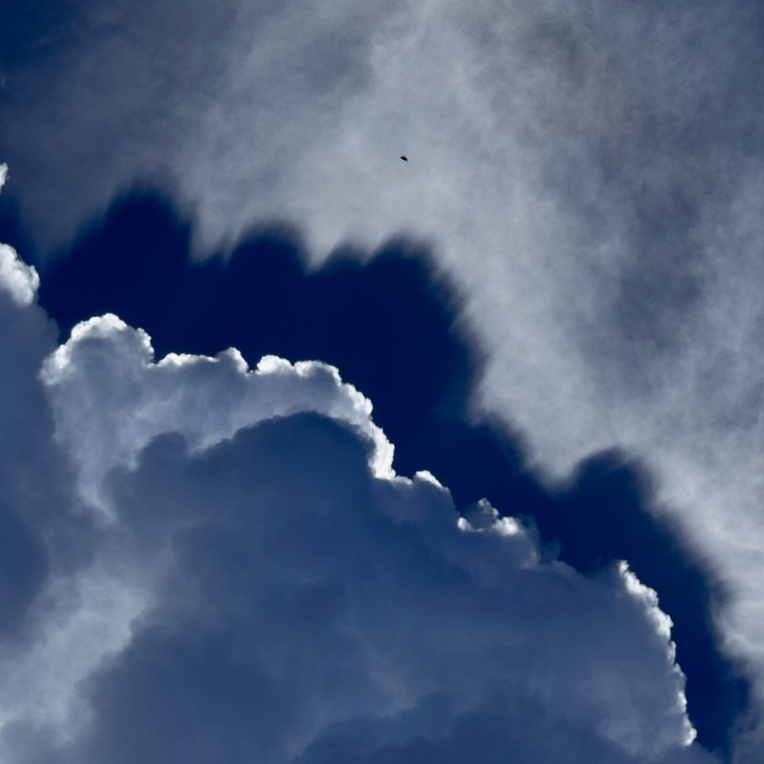 And there’s another bit of cloudy deception at play here. It looks as though the Cumulus cloud, in the lower left of the image, is casting its shadow up to a higher cloud beyond. But, in fact, what we’re seeing is a very tall Cumulus, known as Cumulus congestus, that is casting a shadow _downwards _onto a thin layer of cloud – likely Altostratus – beneath its summit.