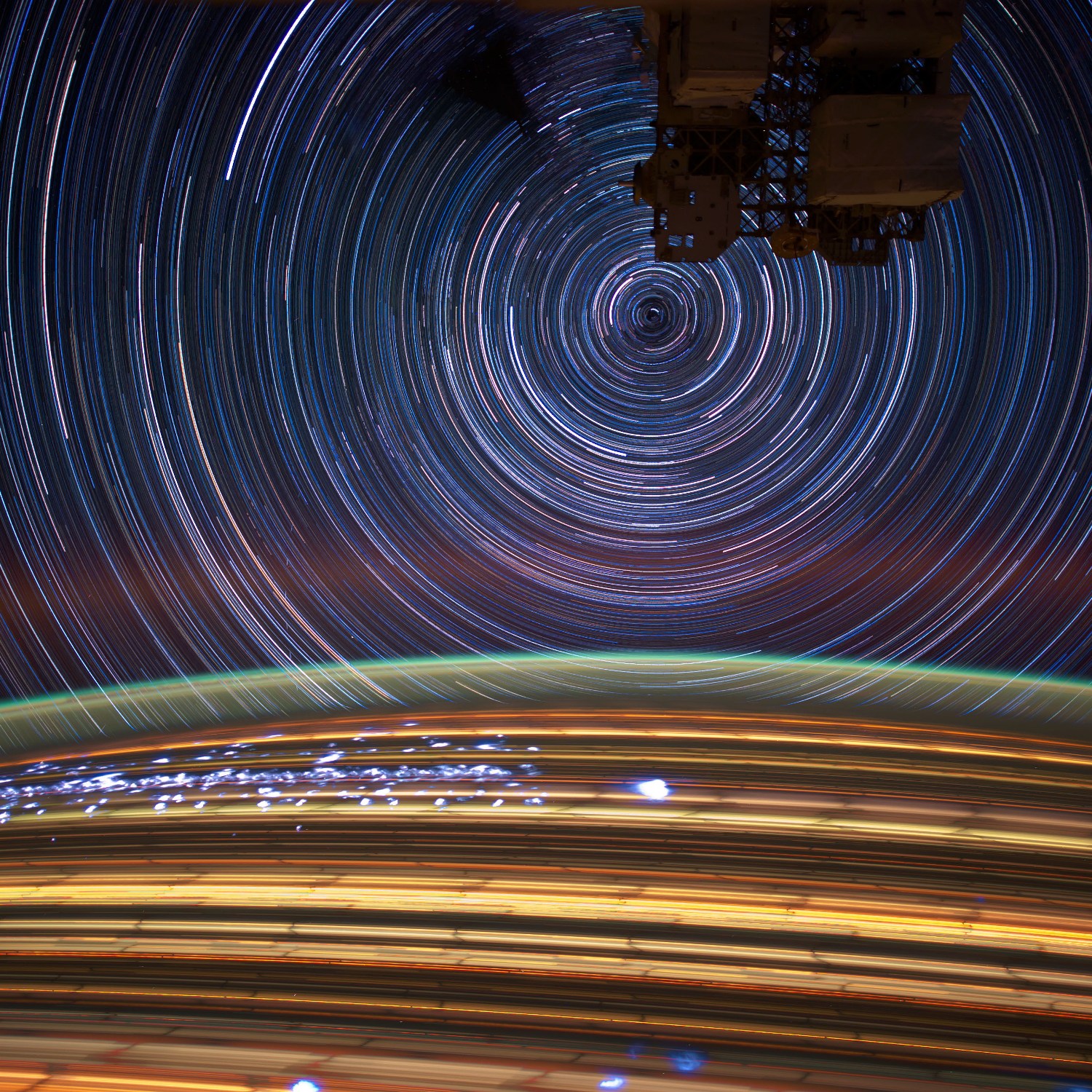 A composite of 72 long-exposure photographs taken by NASA astronaut Don Pettit from the International Space Station (ISS) as it passed over South America. Due to the long exposure, stars appear as circular arcs around the poles of the rotating ISS. The horizontal lines are made of pale yellows from the artificial lights of cities and deeper oranges that are likely from small fires burning in South America. The bright white spots towards the horizon are flashes of lightning from thunderstorms, while the green arc above is airglow, a faint ambient light emitted at night by gases in the Earth’s atmosphere.