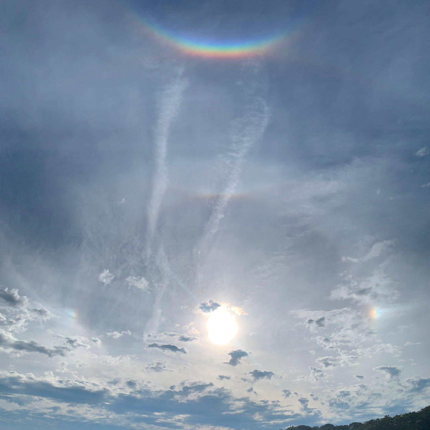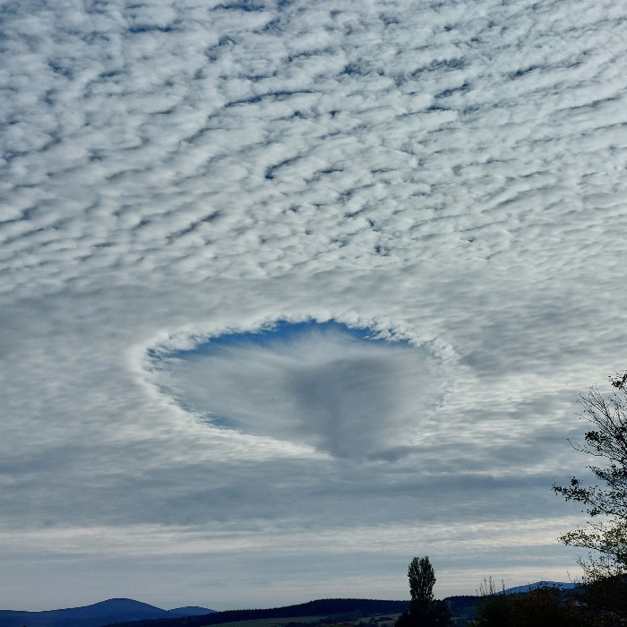 A classic example of a fallstreak hole (cavum) within a layer of altocumulus, with signs of iridescence near the leading edge of the descending ice crystals, spotted over Lyons, Oregon, US