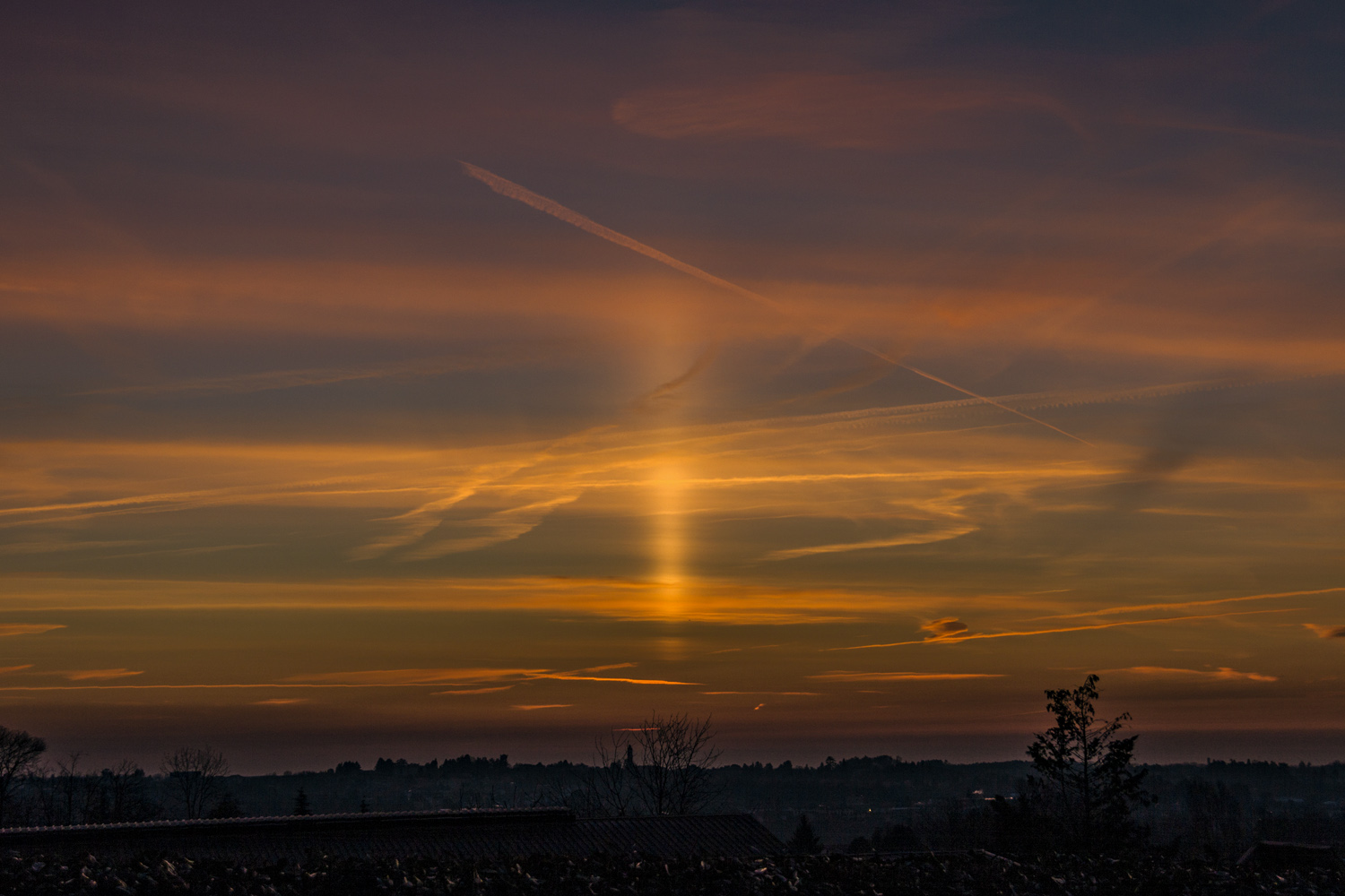A very bright sun pillar over Sumirago, Varese, Italy.