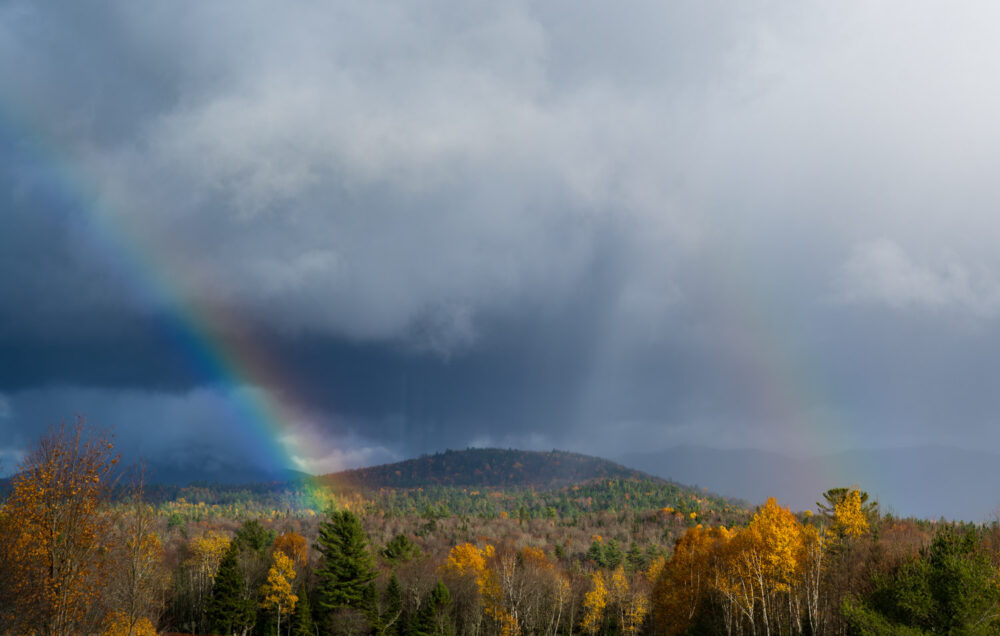Primary and secondary bows with precipitation falling in the distance, spotted near Vermontville, Adirondacks, New York, US