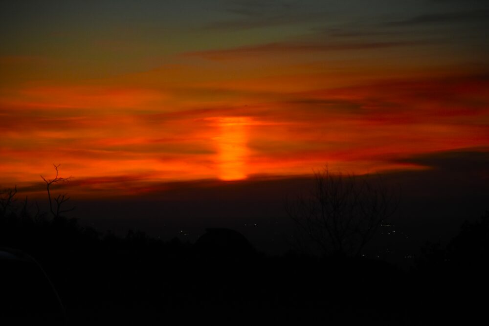 Sun pillar at sunset over Monte Porzio Catone, Rome, Italy