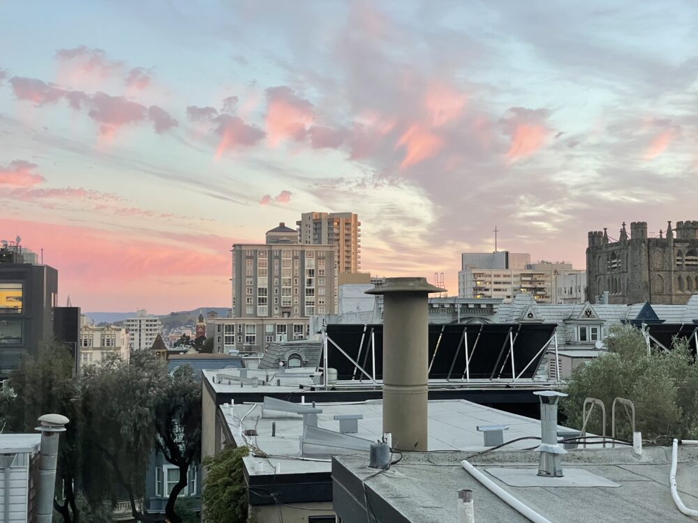 A sunset sky that looks like a painting, accompanied by virga over San Francisco, California, US