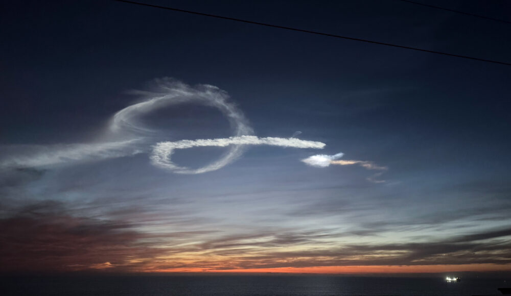 Sunset over the Pacific Ocean with the contrails of a SpaceX rocket and its boosters spotted near Manhattan Beach, California, US