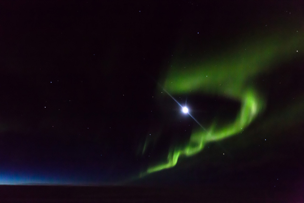 2 thoughts on ““The Aurora Borealis over Greenland, spotted about an hour before sunrise with the moon shining bright over an undercast sky”.”