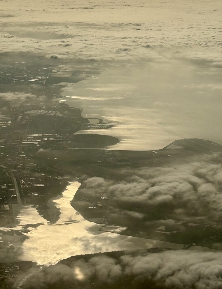 Above the clouds over the Oakland estuary and the San Francisco Bay, near Oakland, California, US