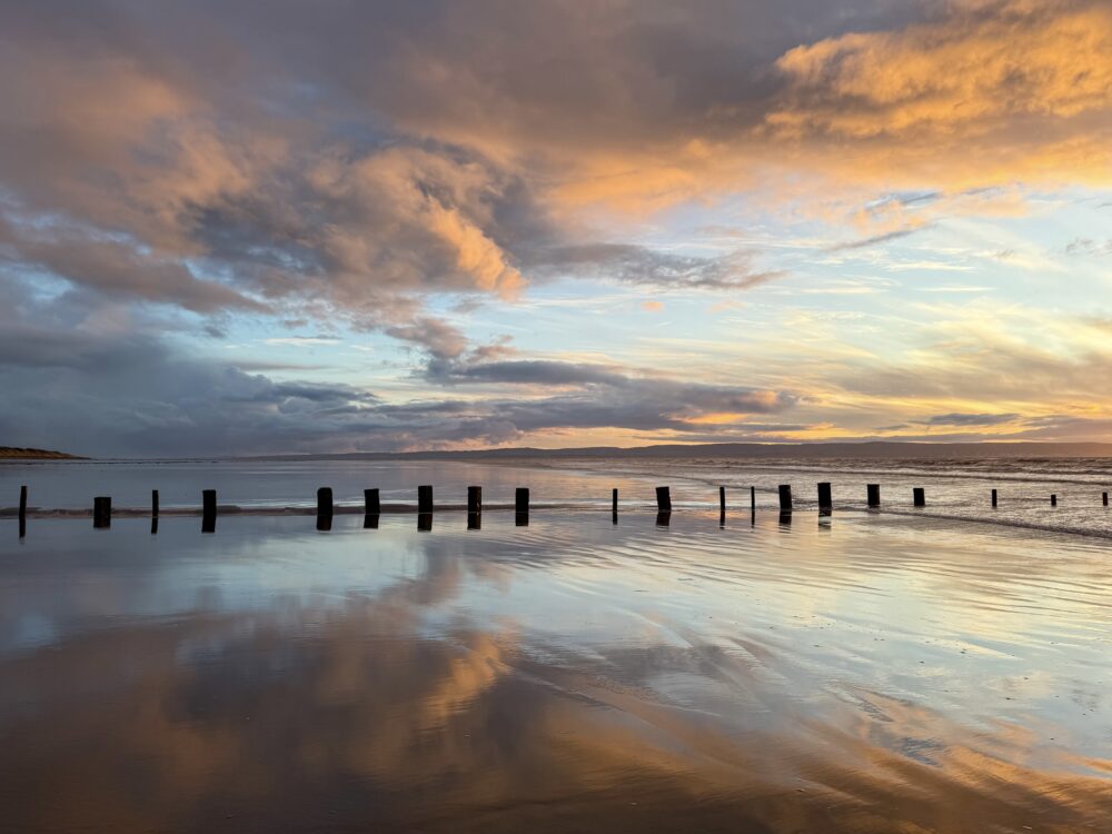 Sunset reflections following the passage of a storm, spotted over Berrow Beach, Somerset, England