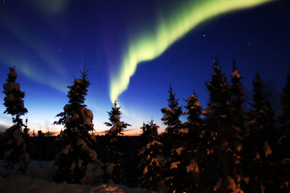The Northern Lights at dusk over Blachford Lake, Northwest Territories, Canada.