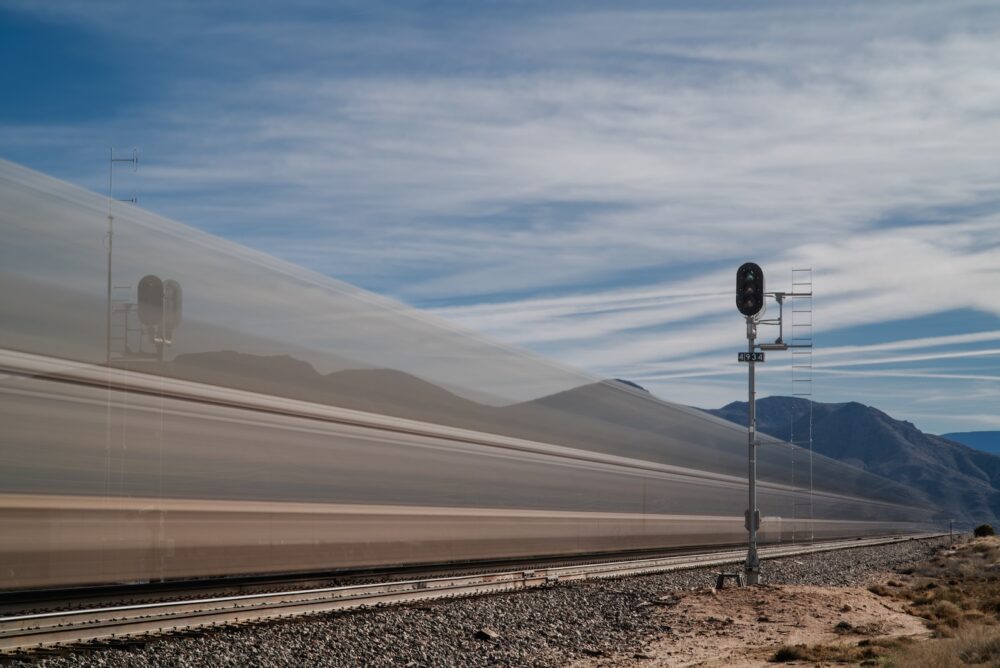 In this photograph set at a 25-second exposure, a freight train deploys a cloak of invisibility beneath Cirrostratus and contrails near Kingman, Arizona, US