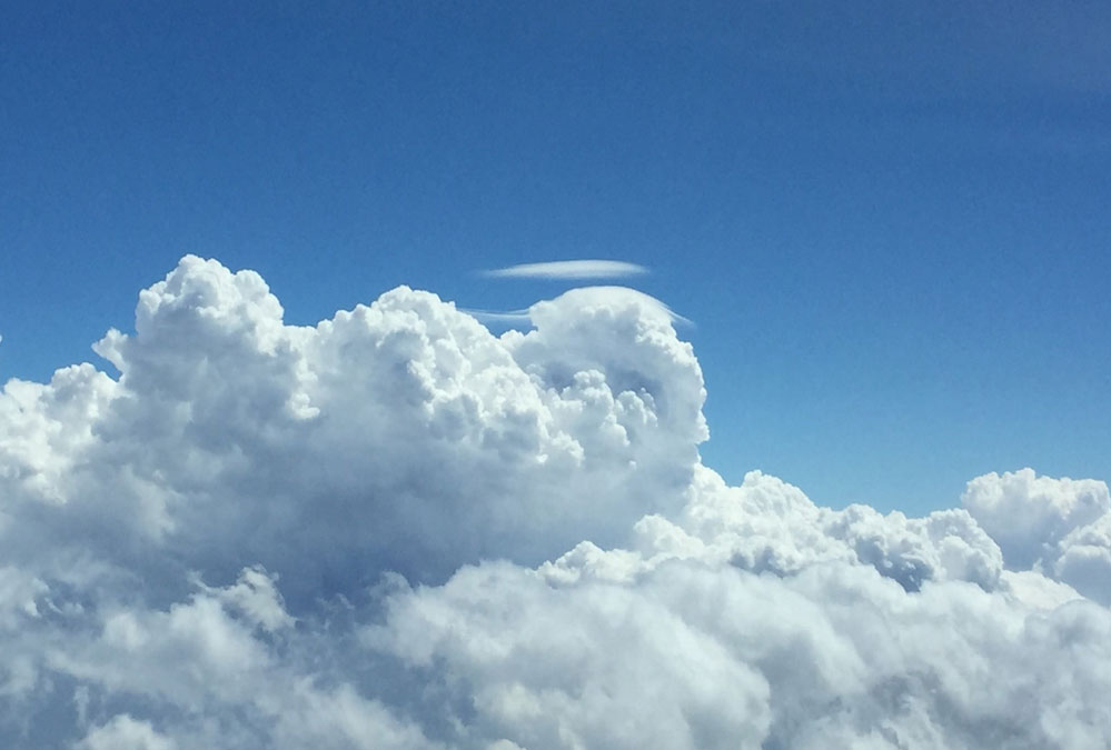 A couple of pileus formations appearing over the summit of a towering Cumulus congestus. Spotted over Arapahoe County, Colorado, US.