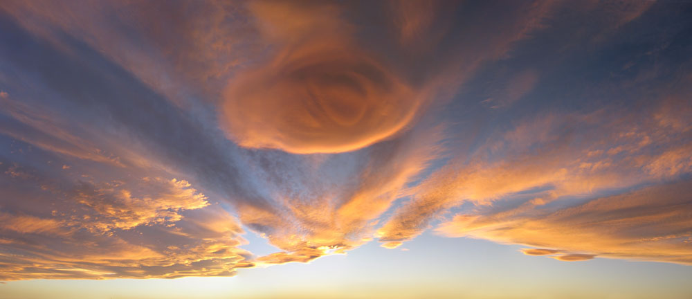 A lenticular cloud at sunset over southern Alberta, Canada. The clouds often accompany strong "chinook" winds on the lea side of the Canadian Rockies. These dry, warm 'snow-eater' winds can abruptly melt as much as a foot of snow in one day, rapidly raising temperatures as much as 40°C (75°F).