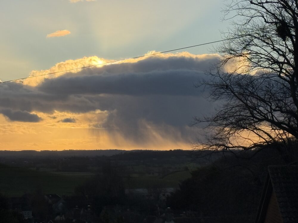 Precipitation beginning to reach the ground, spotted near sunset over Westbury sub Mendip, Somerset, England