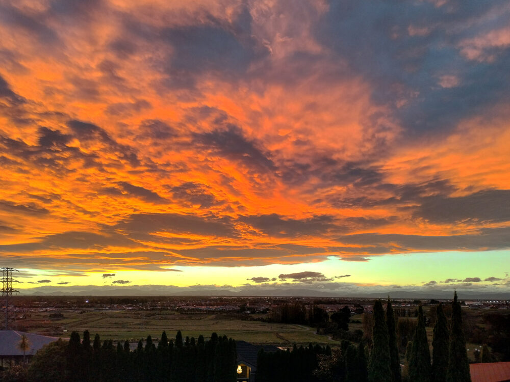 A mesmerizing sunset viewed looking west towards the Southern Alps, from Christchurch, New Zealand