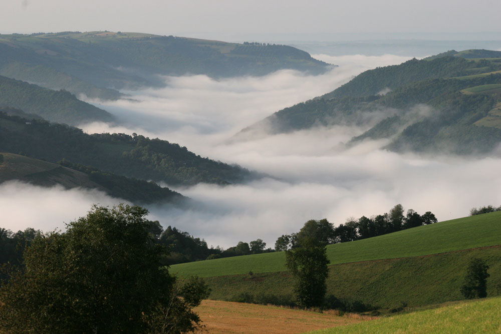 A river of stratus meanders through an area of France, where the Meridienne Verte and the valley of the river Lot cross.