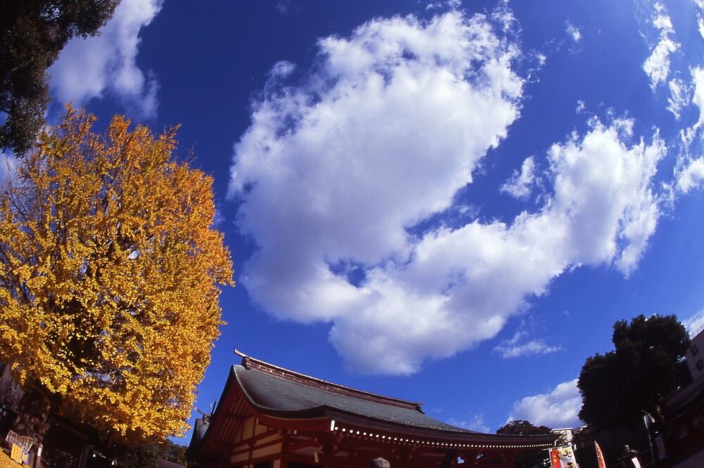 Cumulus clouds meeting in the sky over Sumiyoshi Shrine, Fukuoka City, Japan