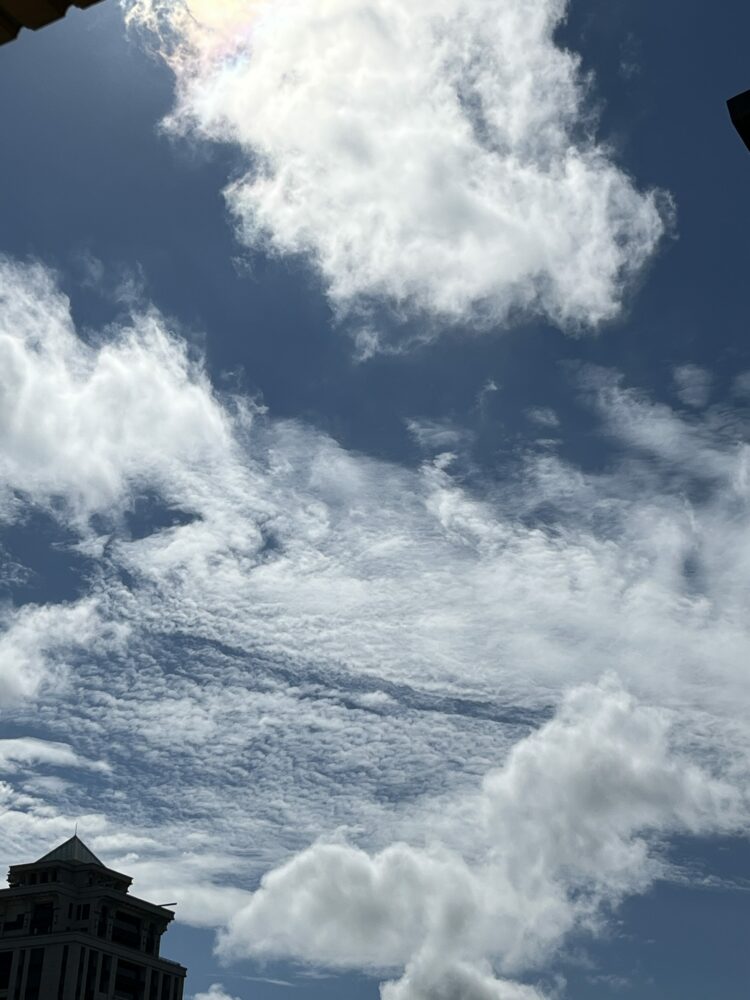 Altocumulus stratiformis with cumulus fractus passing underneath, spotted over Zhongzheng District, Taipei City, Taiwan