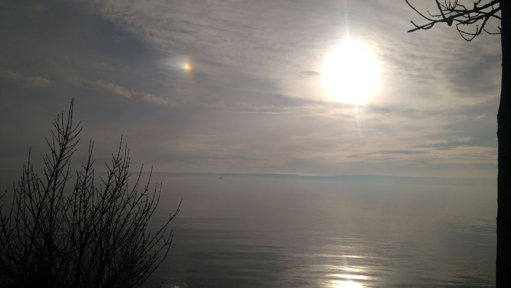 A bright sundog and a hint of coronal colour around the sun, over Lake Constance, with Switzerland in the background.