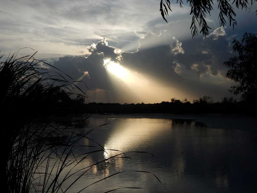A sunset, rays and clouds over Stoneridge Lake, Yukon Oklahoma, US.