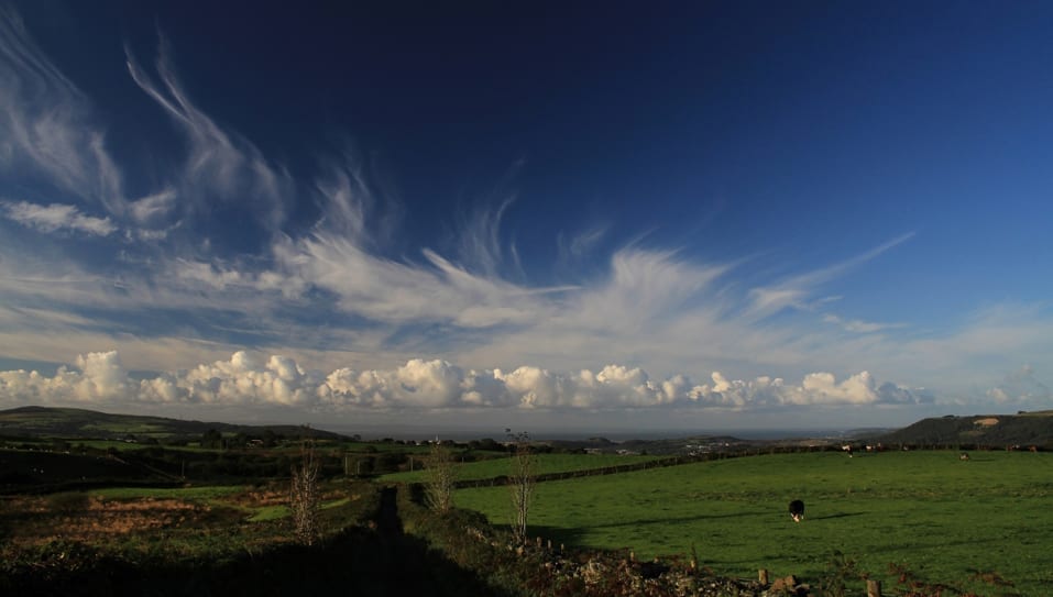 A mix of high and low clouds over the vale of Neath, Wales.