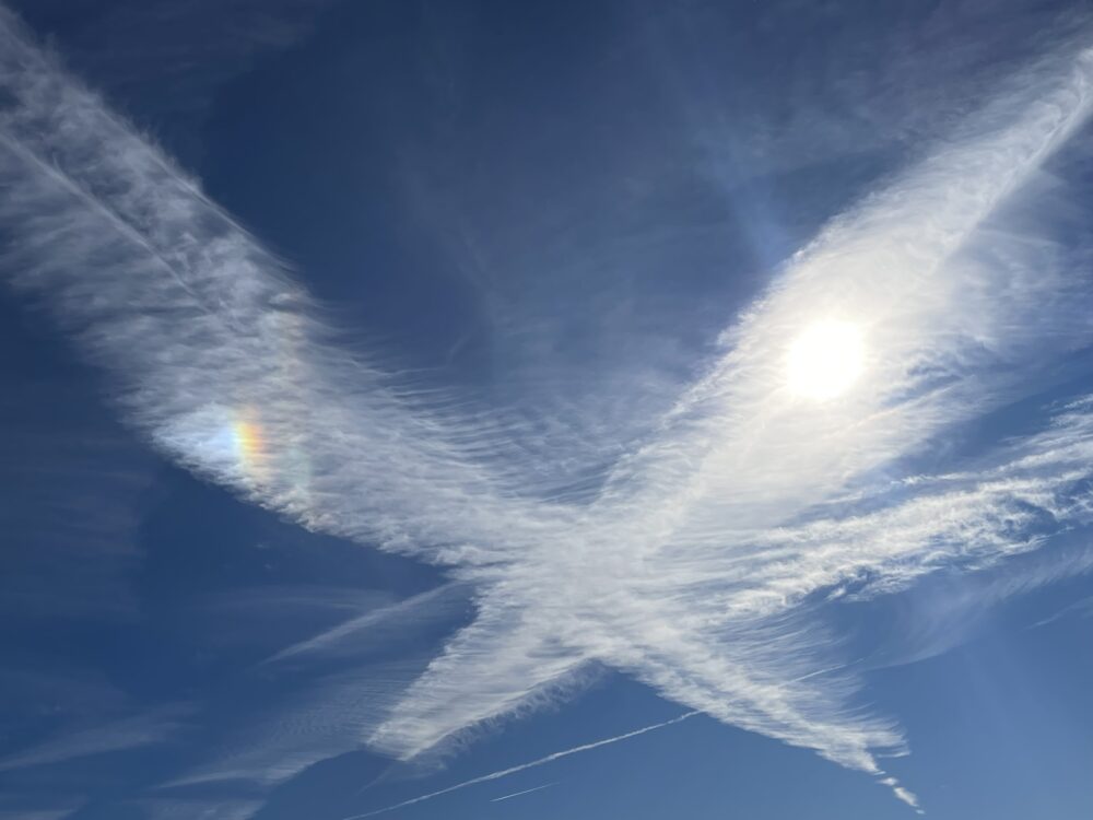 Sun Dog (Parhelion) spotted amidst the remnants of contrails over Fixin, Burgundy, France