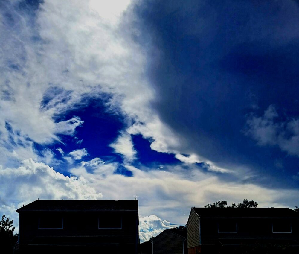 An opening to the blue sky amidst the surrounding clouds over Orlando, Florida, US