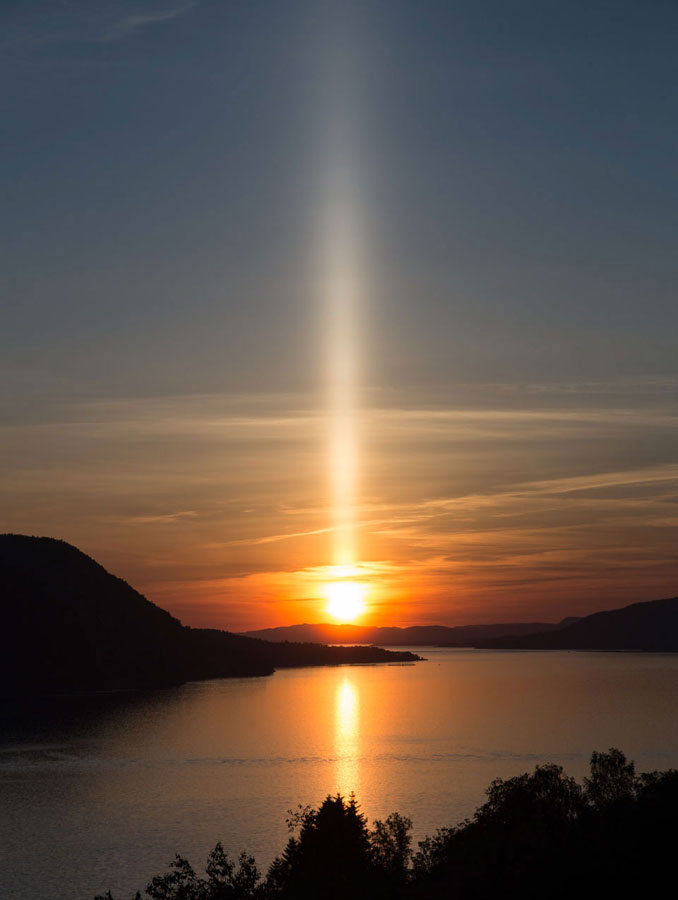 A sun pillar over Fensfjorden, Norway.