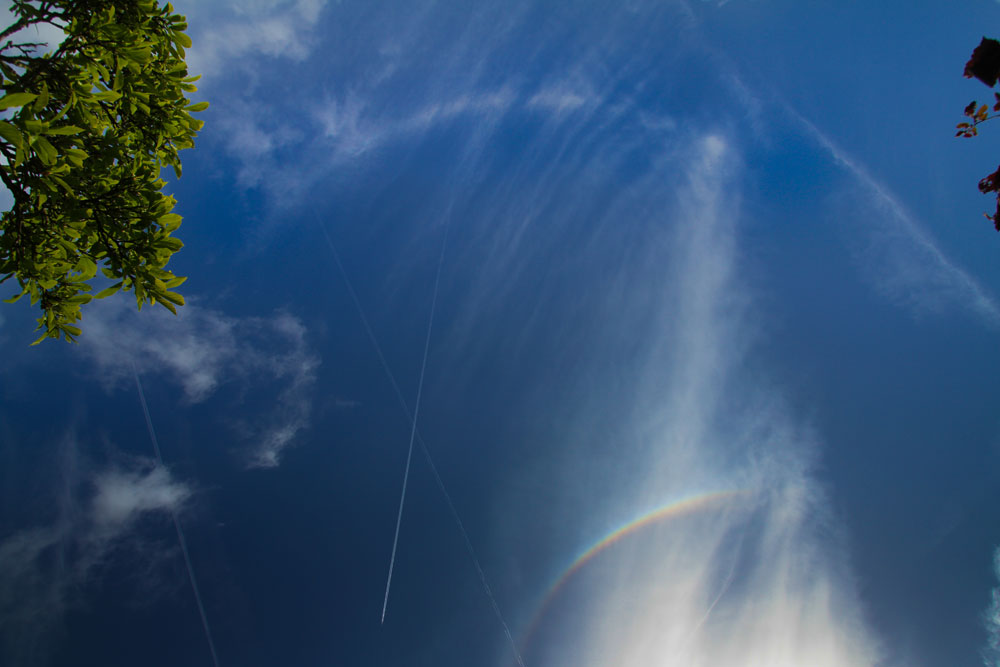 Most interesting picture, Hans. Looks like a vertical shot taken, where you can see a mixture of different weather phenomenon in the one place that doesn’t often get seen together, from precipitation and rainbows, to sun-dogs and halos, to contrails. From Rebecca Hill.