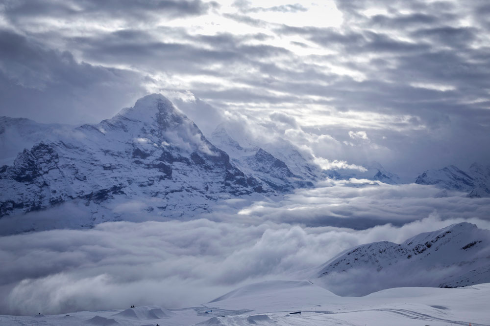 A view of the Grindelwald valley, with clouds above and around the Eiger, in Switzerland.