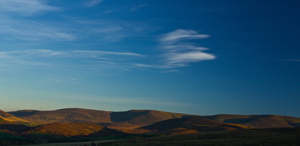 One thought on “The clouds mirror the Autumnal sun lit terrain below in Glenlivet, Scotland.”