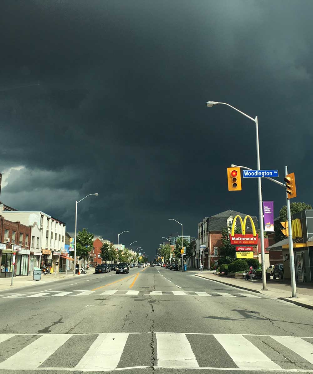 2 thoughts on “The dark, ominous base of a Cumulonimbus gathering over Toronto, Ontario, Canada.”