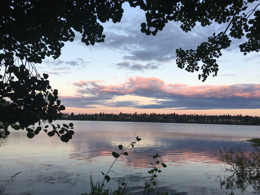 Reflection of stratocumulus near sunset over Green Lake, Seattle, Washington, US
