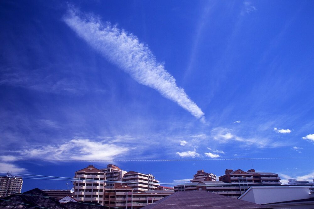 A feather-like contrail spotted in the morning sky over Atagohama, Fukuoka City, Japan