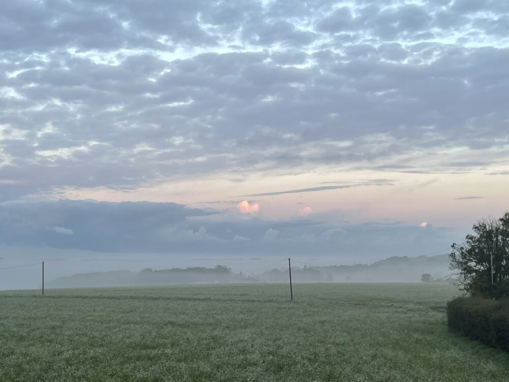 Contrails and cumulus in harmony above the Suffolk countryside, spotted over the Ickworth House, Suffolk, England