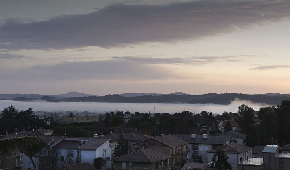 Really nice, peaceful picture of the muted sunset over Jesi, Italy after another long day! The evening mist in the background looks like it is coming in from the sea, with a wave about to crash upon the shore! From Rebecca Hill, Canberra, Australia