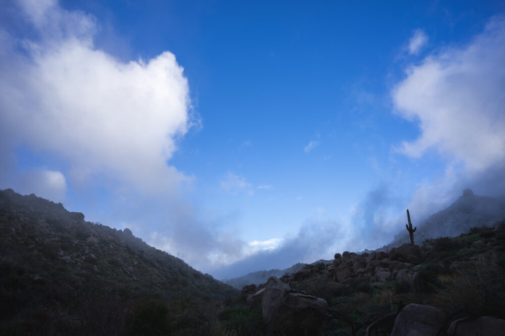 Low clouds drift through a quiet valley after morning rain, spotted over Tonto National Forest, Arizona, US
