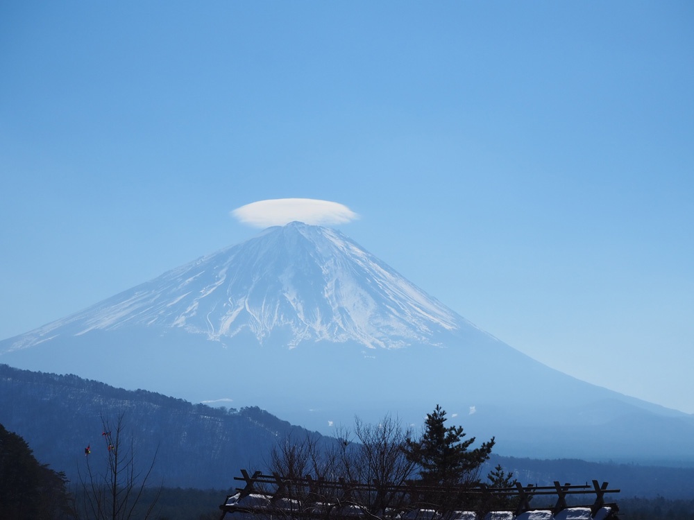 Looks like you got a good shot of Mt Fuji, 3,775m on a beautiful, cool clear day in early spring in early March of perfect preportions with the surrounding landscape, with its snow-capped top and a small, lenticular cloud hat at the very top. The foreground colours are quite monochrome in different shades of dark blue in comparison to the sky and mountain.