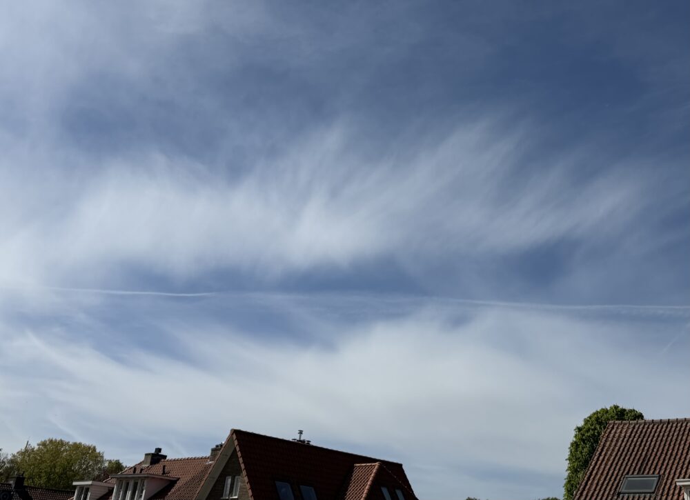 A contrail splitting the sky, spotted amidst altostratus over Arnhem, The Netherlands