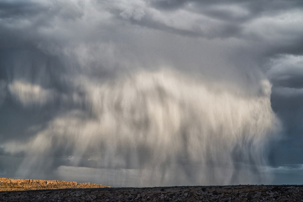 A curtain of precipitation illuminated by the setting sun over Bluff, Utah, US.