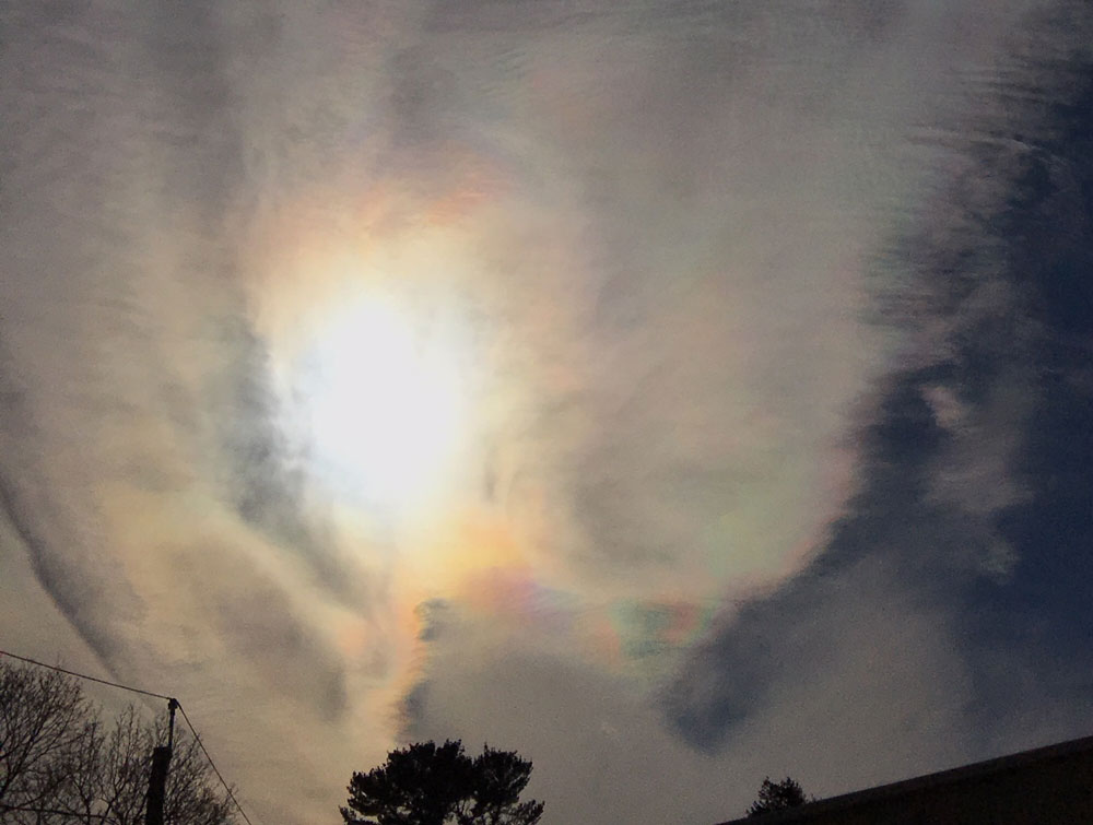A fragmented corona and iridescence over West Newton, US.