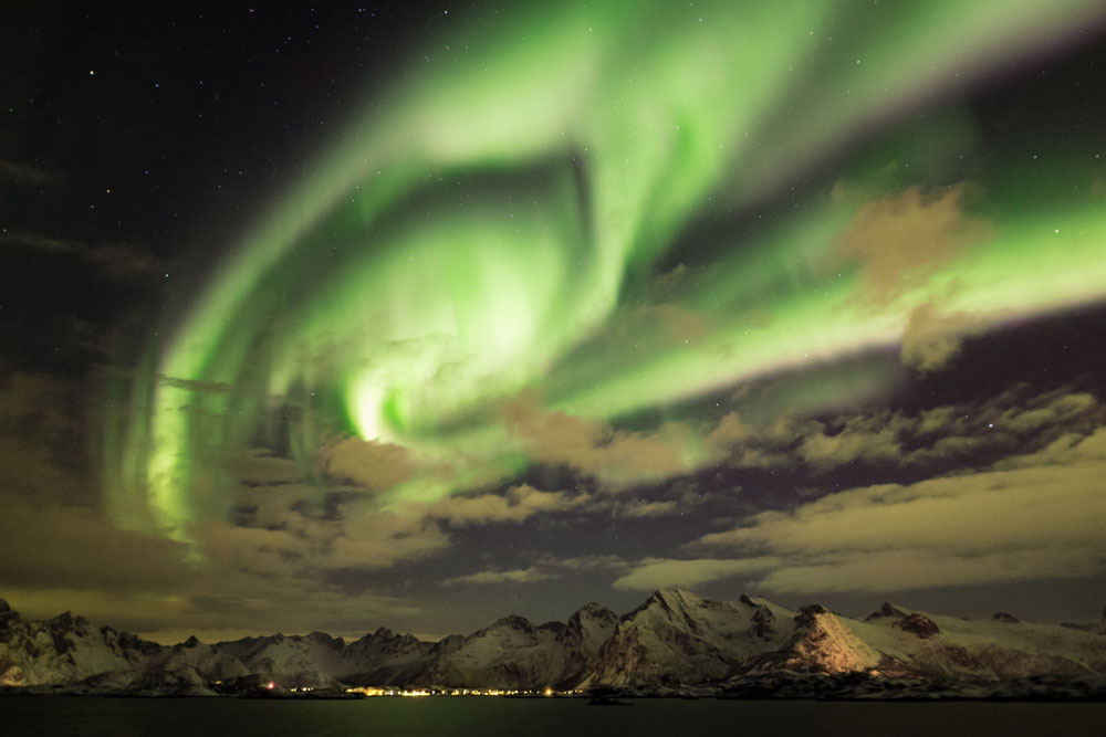 The Aurora Borealis, northern lights over the Lofoten Islands, Norway.